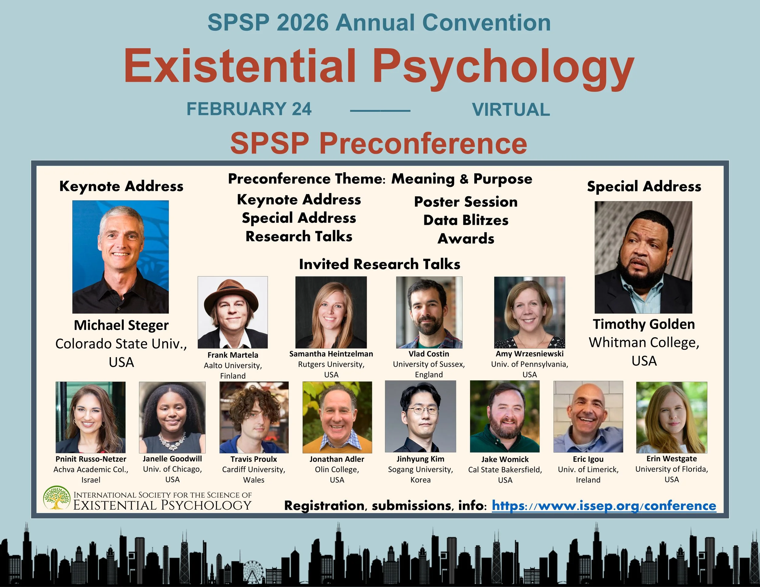 The event is organized by the International Society for the Science of Existential Psychology (ISSEP) and will be hosted by the Society for Personality and Social Psychology (SPSP) virtually on Tuesday February 24, 2026. Be sure to JOIN ISSEP to become eligible for the conference awards!