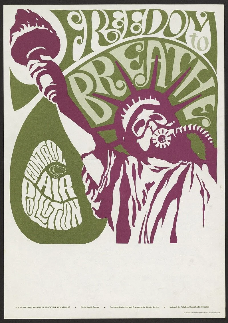 To emphasize the need to control the quality of the country’s air, the U.S. Department of Health, Education, and Welfare produced this poster in 1969 depicting the Statue of Liberty, an American symbol of freedom, wearing a gas mask because she has lost the freedom to breathe clean, healthy air. (Credit: Carl F. Meyers, Jr., 1969; archived by the Smithsonian at the National Museum of American History)