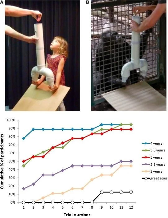 A recent experiment by Redshaw and Suddendorf (2016) underscored the essentially human aspect of understanding the future as a ‘matrix of maybe’—that is, a set of alternative possibilities, often several of which are attended by probabilistic contingencies. The study included human children as well as adult chimpanzees, orangutans, and gorillas. They all learned that a treat would be dropped into the top of a long tube and would come out the bottom; if they caught it they could keep it, otherwise it would drop into a pit and be gone forever. Everyone learned to put their hand underneath the open bottom and catch the treat. Then the experimenters brought out a new tube which had two openings at the bottom, like an upside-down Y. The treat came out one side or the other, at random, so if one only covered one opening then one only caught it half the time.