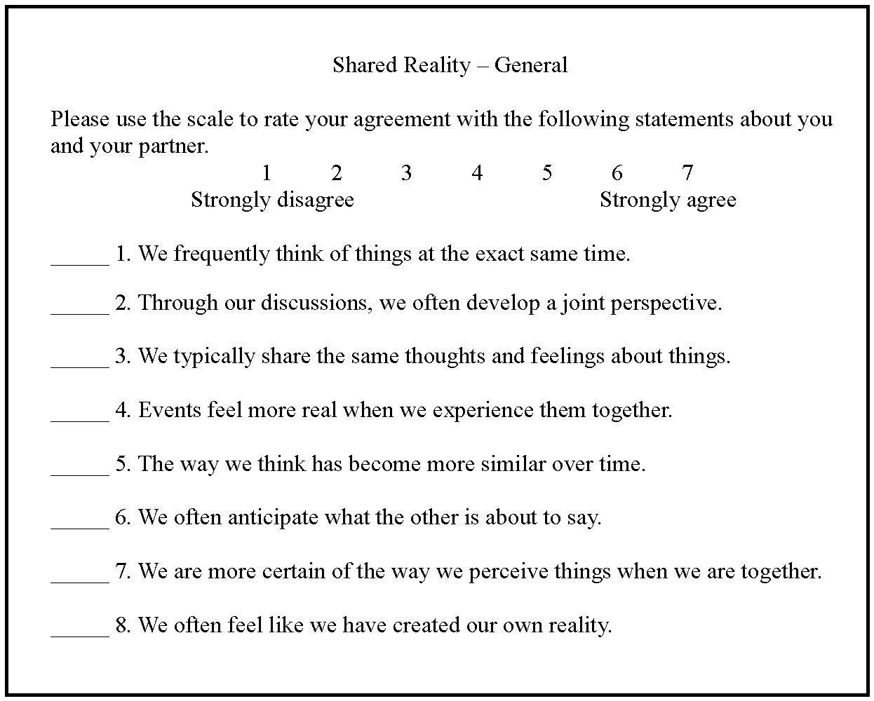Participants’ sense of shared reality with their romantic partner was measured using the “Shared Reality - General” instrument (Rossignac-Milon et al., 2021).