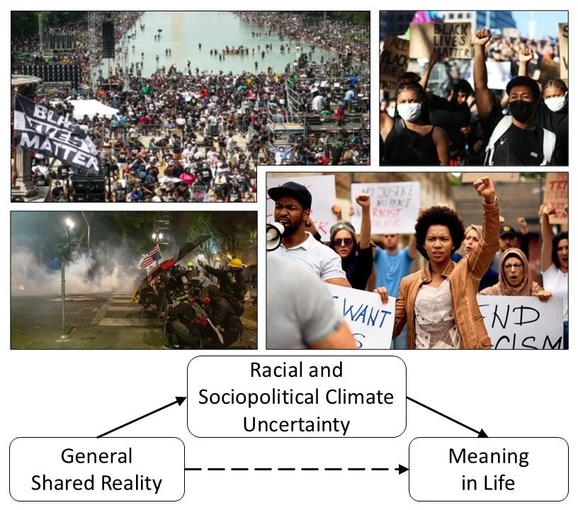 In the first context, we examined how shared reality with a romantic partner influenced Black Americans’ experiences of racism following the murder of George Floyd and amidst the Black Lives Matter protests. We found that Black Americans who had a strong sense of shared reality with their romantic partners felt less uncertain about racism and the sociopolitical climate, which in turn made their lives feel more meaningful. In other words, when you feel on the same page about the world with your partner generally, including about your experiences in society (e.g., how to process experiences of discrimination, how to engage with social movements), you gain more clarity about navigating these challenges. As a result, you can extract more meaning from your life.