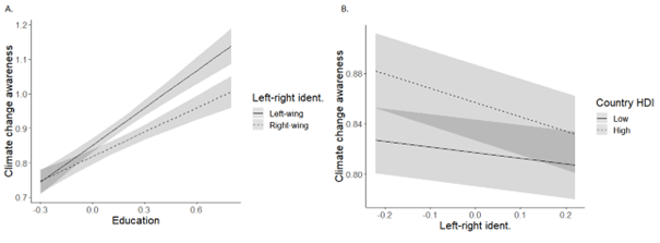 Figure 4. The effect of education on climate change awareness in Europe. (A) The effects of education for the political right and left. (B) The effects of left-right identification at high and low HDI. The analysis is based on 2016 European Social Survey data (N=135,431). The grey shaded area represents 95% confidence intervals. Note: HDI summarizes information from indices such as life expectancy, education, and standard of living in a country.