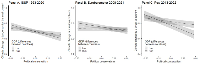 Figure 6. Between-country differences in GDP moderate the association between political conservatism and climate change concern across ISSP (Panel A), Eurobarometer (Panel B), and Pew dataset (Panel C). The figures are based on the analysis with multiple moderators, the slopes are shown at +/- 1 SD around the mean of the moderator, and the shaded area corresponds to 95% confidence intervals.