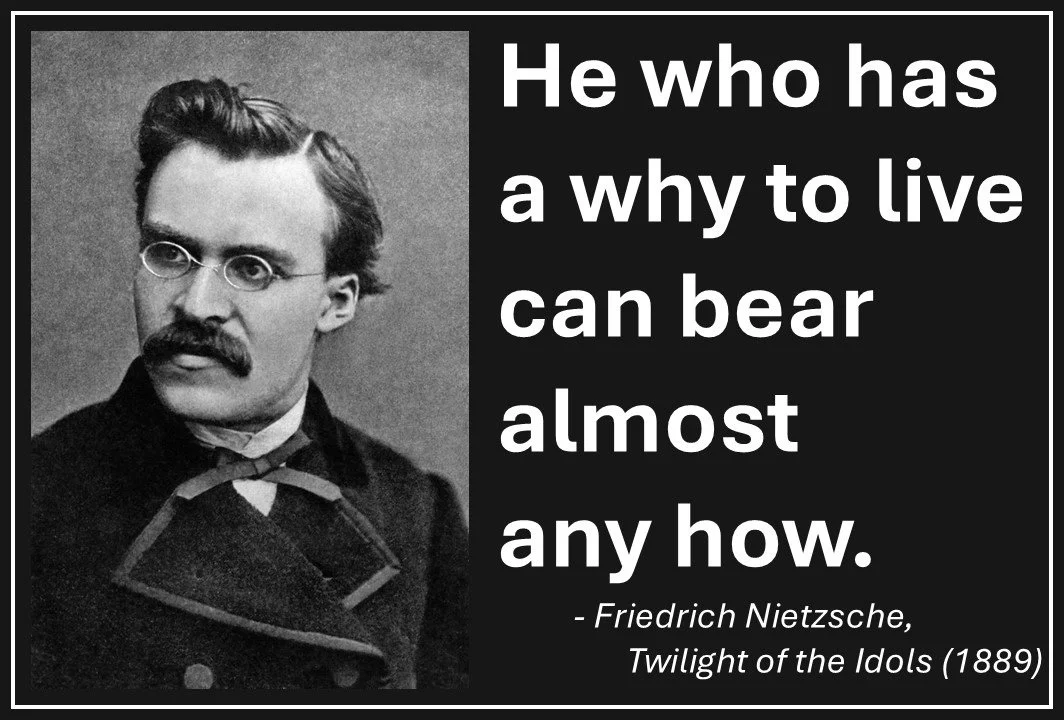 I also think meaning is critical. We often ask people to “hold on” through immense suffering. But, how do we motivate that endurance without a compelling “why”? That’s where I see existential psychology playing a protective role. As Nietzsche scrawled, in Twilight of the Idols (1889), “He who has a why to live can bear almost any how.”