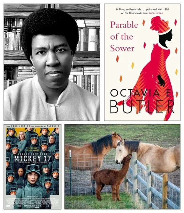 Clockwise from top left: Octavia Butler and her book Parable of the Sower (1993), hobby farm with horses and alpaca, and Mickey 17 (2025).