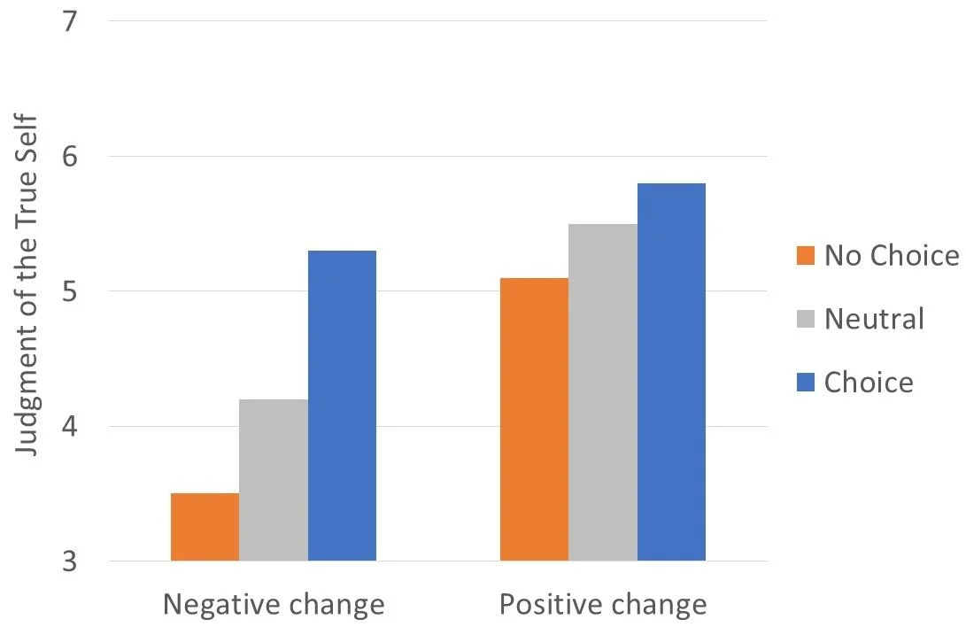 To examine this further, we added a neutral condition where Daniel became a doctor without conflict, simply going along with expectations. The results confirmed the pattern. The choice condition received the highest true self judgments, the neutral condition was moderate, and the no choice condition was lowest. The interaction also showed that in the choice condition, the gap between positive and negative changes was smallest, meaning autonomy reduced the positivity bias. These findings suggest that our conception of the true self isn't only about goodness. We see others as most genuinely themselves when they are the authors of their own lives, even when the story they're writing includes difficult chapters.