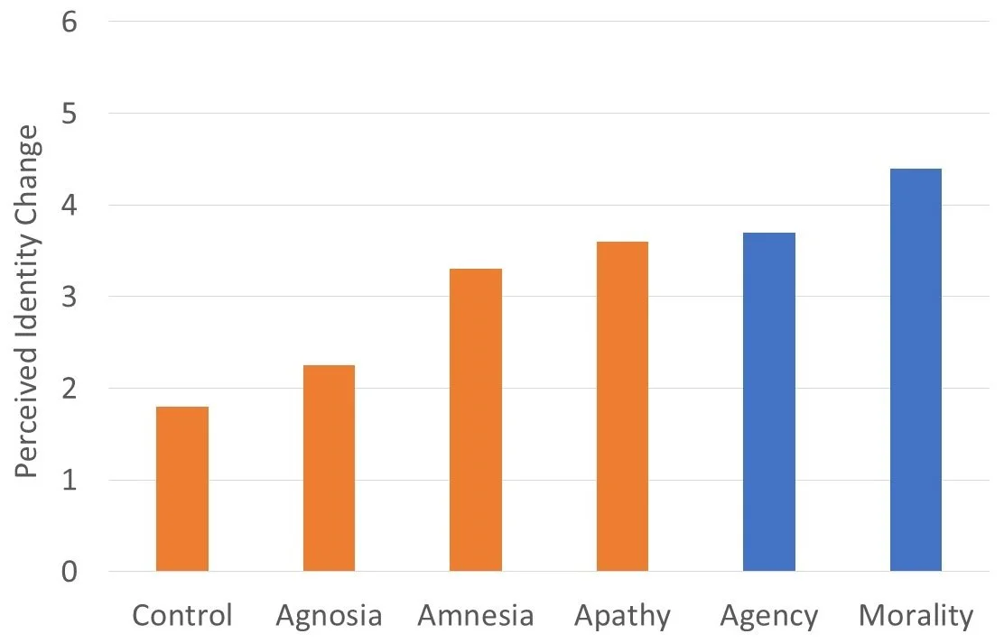 To start, we wanted to confirm whether agency is central to identity. We replicated Strohminger and Nichols (2014), who showed that losing moral capacity after brain surgery causes the greatest perceived identity change. We added a sixth condition, losing agency, defined as the sense of control over one's actions and authorship of one's decisions. Results confirmed that losing morality still had the strongest effect. However, losing agency came second (Figure 1), significantly stronger than losing memory or other cognitive abilities. This suggested agency plays a distinct role in identity.